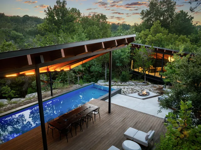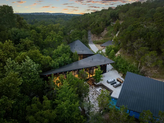 Wander Austin Falling Leaves, featured in Architectural Digest, is a stunning glass house perched 20 feet above a creek.